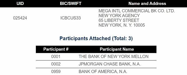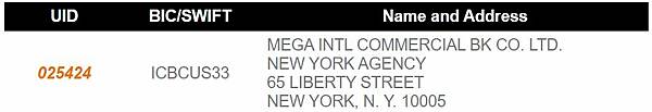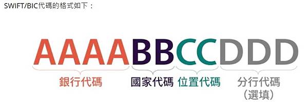 舉例:ICBCTWTP007,翻譯後就是兆豐銀行(International Commercial Bank of China)台灣台北(Taiwan Taipei)營業部(007分行)