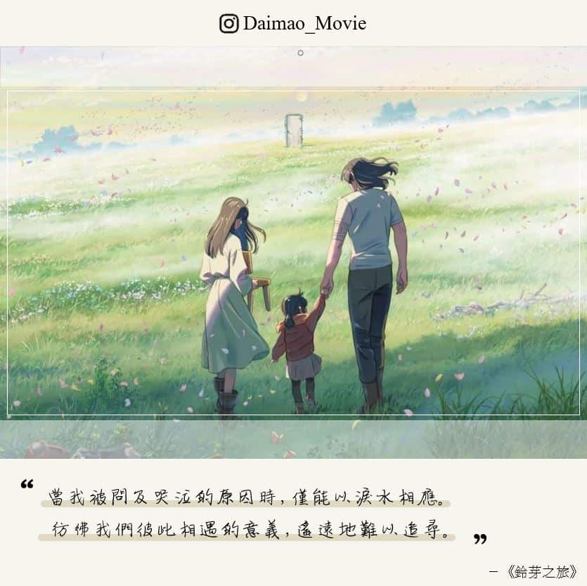 「當我被問及哭泣的原因時,僅能以淚水相應。彷彿我們彼此相遇的意義,遙遠地難以追尋。」-《鈴芽之旅 》主題曲